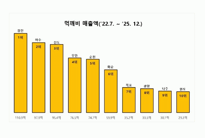 더불어 강진군의 먹깨비 누적 매출액은 2025년 12월 기준 12월 110억 원을 돌파하여 전라남도 내 굵직한 시군을 제치고 당당히 1위를 차지했다.