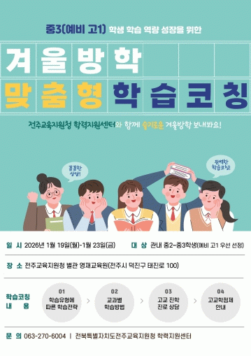 전주교육지원청 별관 영재교육관에서 진행되는 학습코칭 프로그램은 오는 19일부터 23일까지를 ‘학부모 동반 학습코칭 주간’으로 지정, 예비 고등학교 1학년(현 중3) 학생과 학부모가 함께 참여하는 1:1 맞춤형 방식으로 운영하는 게 특징이다.