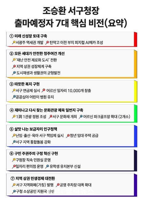 미래 신성장 토대 구축(서광주 역세권 개발, 탄약고 이전 부지 피지컬 AI메카 조성), 안전한 정주 여건 개선(‘재난 안전 제로화 도시’ 전환, 지역 상권 성장체계 구축, 도시재생과 생활권의 균형발전), 따뜻한 복지 구현(서구 연금제 실시, 어르신 일자리 10,000개 창출, 공공심야 어린이 병원 유치), 문화관광 체육 일번지(1洞 1관광 정원 조성, 서구 문화재 개최, 어르신 파크골프장 확대 2개소), 보금자리 인구정책(난임ㆍ출산ㆍ육아 서구 책임제 실시, 청년 임대 주택 공급, 서구 지역 통합돌봄 강화), 구민주권 구정 혁신( 구청장 직속 민원실 운영, 일자리 편의점 운영, 유학생 유치본부 신설), 민생경제 대전환(서구 지역화폐(가칭) 발행, 공영 주차장 대폭 확대, 구청 소상공인 지원국 신설) 등이 주요 핵심 비전이다.