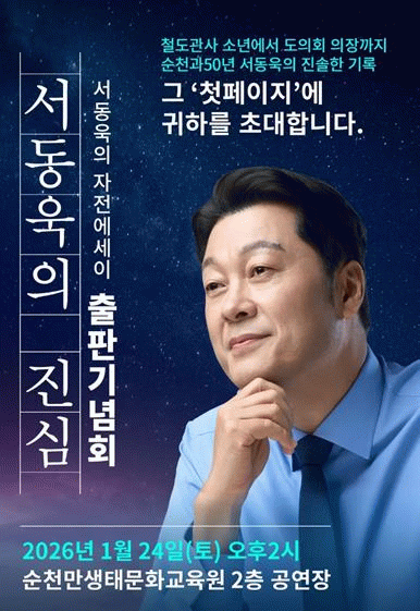 서동욱 전 의장은 “이 책은 정치인의 성과 보고서가 아니라, 순천에서 살아온 한 시민의 진심 어린 기록”이라며 “출판기념회가 순천의 다음 10년, 20년을 함께 상상하고 이야기하는 계기가 되길 바란다”고 말했다.