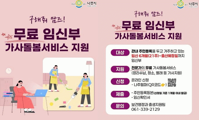 나주시는 임신으로 인해 일상적인 가사 활동이 어려운 임신부를 대상으로 전문 가사돌봄 서비스를 제공하는 ‘임신부 가사돌봄서비스 지원사업’을 지난해에 이어 올해도 운영한다고 22일 밝혔다.