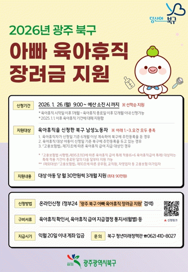 25일 북구에 따르면 오는 26일부터 ‘2026년 아빠 육아휴직 장려금’ 신청이 시작된다.