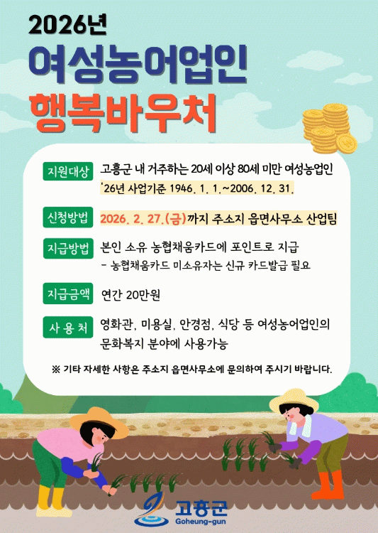 신청을 희망하는 여성농어업인은 2월 27일까지 주소지 읍·면사무소를 방문해 신청할 수 있으며, 자격 검증을 거쳐 최종 선정된 대상자에게는 3월 중 바우처 포인트가 지급될 예정이다.