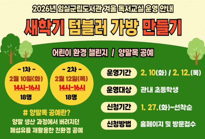 겨울 독서교실은 2026년 2월 10일부터 12일까지 임실군립도서관 1층 다목적실에서 총 2회 진행되며, 관내 초등학생을 대상으로 운영된다. 참여 신청은 1월 27일부터 2월 6일까지 온라인 및 방문 접수로 선착순 모집한다.