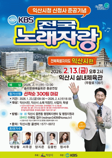 시는 전국노래자랑이라는 대중적 플랫폼을 통해 익산의 변화된 위상을 알리고, 시민들이 주인공이 돼 신청사 시대의 개막을 축하하는 소통의 장으로 만들 계획이다.