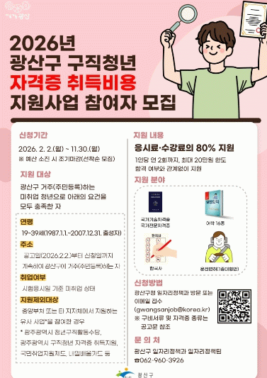 광산구는 2월부터 고물가와 취업난이란 이중고 상황에서 청년의 취업 역량 강화와 구직 활동에 드는 경제적 부담 완화를 돕는 ‘2026년 구직 청년 자격증 취득비용 지원사업’을 추진한다고 2일 밝혔다.