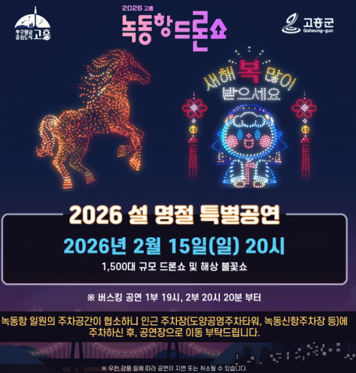 설 특별공연은 기상 상황에 따라 지연되거나 취소될 수 있으며, 정확한 공연 일정은 고흥군 대표 누리집과 녹동항 드론쇼 누리집, 인스타그램을 통해 확인할 수 있다.