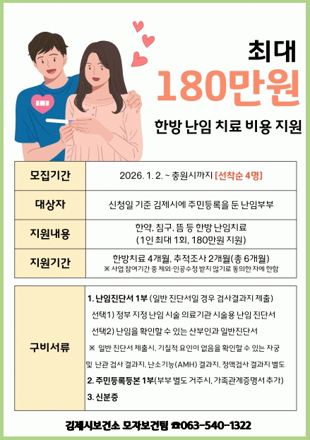 보건소 관계자는“한방 난임 치료는 신체 전반의 건강 회복을 돕는 치료로, 난임부부에게 또 하나의 선택지가 될 수 있다”며“앞으로도 난임 극복을 위한 다양한 지원을 통해 출산 친화적인 지역 환경을 조성해 나가겠다”고 말했다.