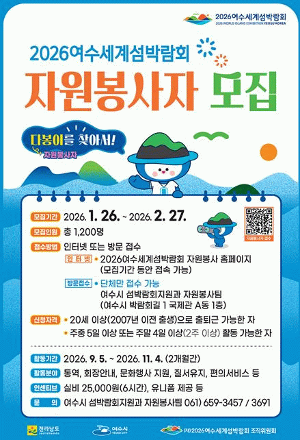 한편, 자원봉사자 신청은 2026여수세계섬박람회 자원봉사 누리집을 통해 온라인으로 접수할 수 있으며 활동에 참여한 다봉이에게는 1일 6시간 기준 활동 실비 2만 5천 원이 지급될 예정이다.