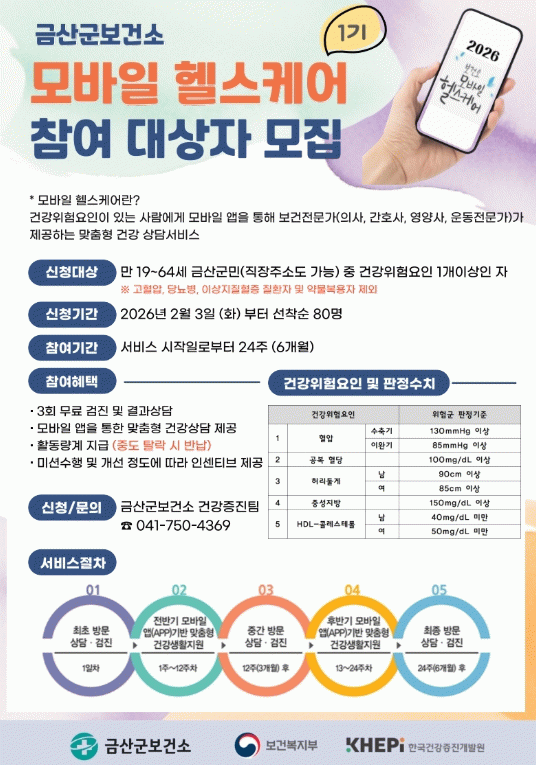 모집 대상은 만 19세 이상 65세 미만의 금산군민 또는 금산군 소재 직장인으로 스마트폰 활용이 가능해야 하며 혈압, 공복혈당, 허리둘레, 중성지방, 고밀도(HDL) 콜레스테롤 등 건강위험 요인을 1개 이상 보유한 경우 신청할 수 있다.