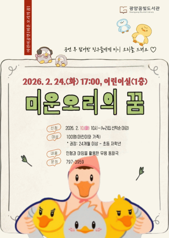공연 관람은 어린이와 가족 100명을 선착순으로 모집하며, 신청은 2월 10일 오전 10시부터 광양시립도서관 누리집을 통해 가능하다.