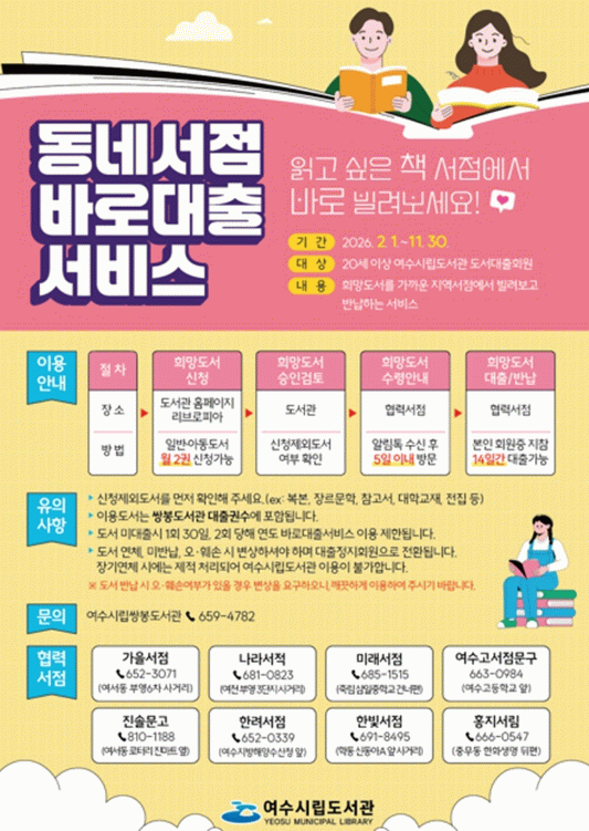 ‘동네서점바로대출서비스’는 20세 이상 여수시립도서관 도서대출회원을 대상으로 도서관을 직접 방문하지 않고도 협약된 가까운 동네서점에서 원하는 책을 바로 대출할 수 있는 서비스다.