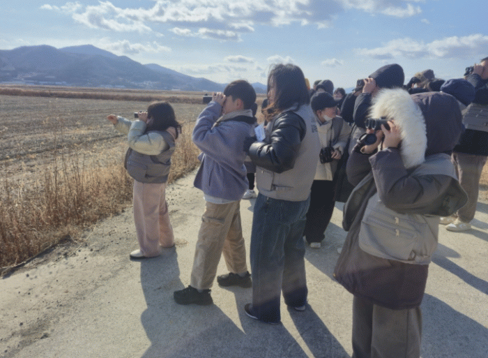 이날 프로그램은 탐조 전문가의 해설을 들으며 쌍안경으로 흑두루미, 왜가리, 민물가마우지 등 철새와 텃새를 관찰한 뒤, 자연물을 활용한 콜라주 기법의 ‘새 그리기 미술 활동’으로 이어졌다.