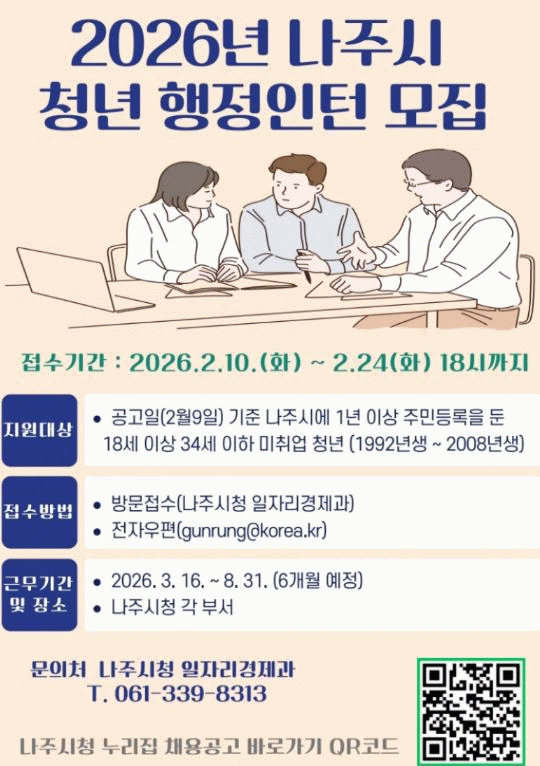 나주시 관계자는 “이번에 처음 시행하는 청년 행정인턴제는 지역 청년들이 행정 현장에서 실질적인 직무 경험을 쌓고 사회 진출에 필요한 역량을 키울 수 있는 제도”라며 “앞으로도 청년들의 안정적인 일자리 확보와 취업 지원을 위한 다양한 정책을 지속적으로 추진해 나가겠다”고 말했다.