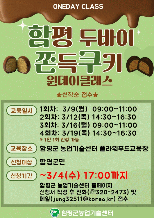 함평군 농업기술센터는 “내달 4일까지 ‘두바이 쫀득쿠키 만들기’ 원데이 클래스 교육생을 모집한다”고 13일 밝혔다.