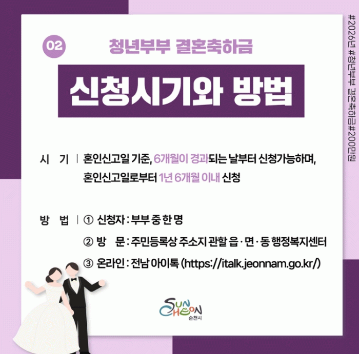 시 관계자는 “이번 결혼축하금 지원이 청년들이 살기 좋은 도시 순천에서 결혼 생활을 시작하는 청년 부부에게 따뜻한 응원이자, 행복한 가정을 꾸리는 데 작은 보탬이 되길 바란다”고 말했다.