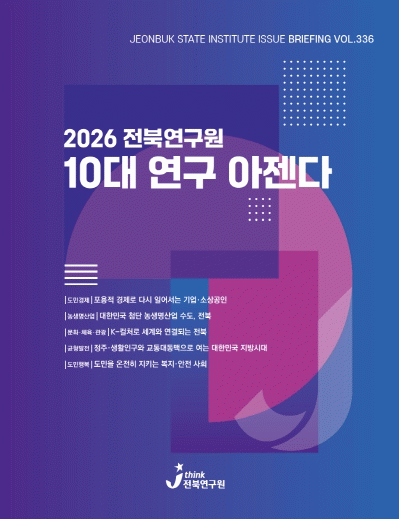 전북연구원은 20일 이슈브리핑을 통해 ▲도민경제 ▲농생명산업 ▲문화·체육·관광 ▲균형발전 ▲도민행복 등 5대 분야를 정책적 틀로 설정하고, 분야별 핵심 과제를 구체화한 10대 연구 아젠다를 확정했다고 밝혔다. 이번 아젠다는 전북의 미래 경쟁력 확보와 지속가능한 지역 발전을 목표로, 중장기 도정 핵심 과제를 선도적으로 뒷받침하는 전략적 연구 과제들이다.