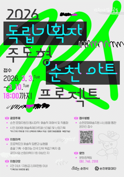 순천문화재단 관계자는 “이번 사업은 독립기획자의 시선과 순천예술인의 현장성이 만나 새로운 예술적 가치를 만들어가는 과정이 될 것”이라며 “순천을 무대로 자신의 기획 역량을 마음껏 펼칠 독립기획자들의 많은 관심과 참여를 바란다”고 전했다.
