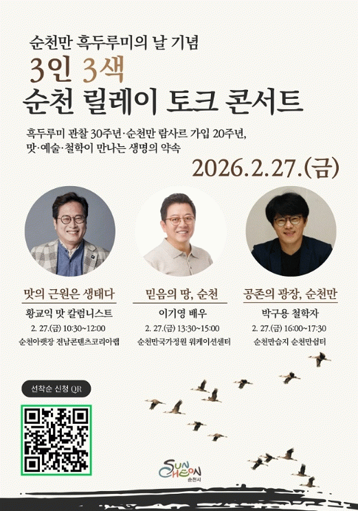 이번 행사의 핵심 프로그램은 2월 27일, 원도심–순천만국가정원–순천만습지로 이어지는 생태경제축 위에서 ‘맛·예술·철학’이 만나는 3인 3색 릴레이 토크 콘서트다. 각 분야의 전문가가 서로 다른 언어로 순천만을 해석해 생태가 삶이 되는 도시 순천의 30년을 이야기한다.