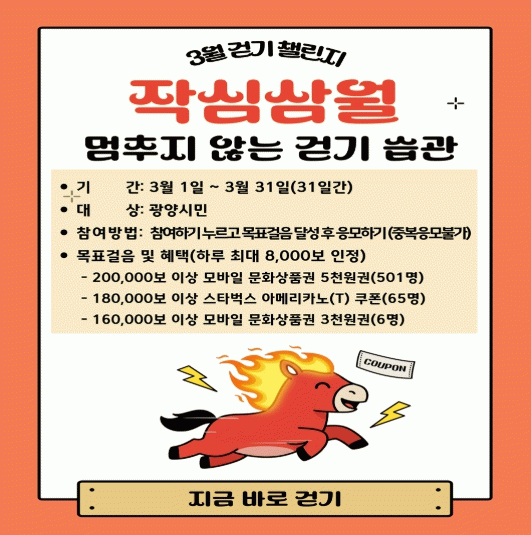 광양시 관계자는 “3월 4일 비만예방의 날을 맞아 이번 걷기 챌린지를 통해 시민들이 일상 속에서 자연스럽게 신체활동을 늘리는 계기가 되길 바란다”며 “걷기 실천을 통해 비만은 물론 고혈압, 당뇨 등 각종 만성질환 예방에도 도움이 되길 기대한다”고 말했다.