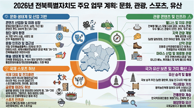 도는 국가유산의 체계적 보존과 활용을 통해 도민의 문화 향유 기반을 확대하고, 이를 미래 성장 자원으로 연결할 계획이다. 남원 광한루, 임실 진구사지 석등 등 도내 문화·자연유산을 발굴해 국보·보물·사적 등 25건의 국가지정을 단계적으로 추진하고, 동학농민혁명의 역사적 가치를 확산하기 위해 유족 수당을 올해 처음 지급하는 한편 고창·부안 일대 성지화 사업과 세계시민혁명의 전당 건립도 이어간다.