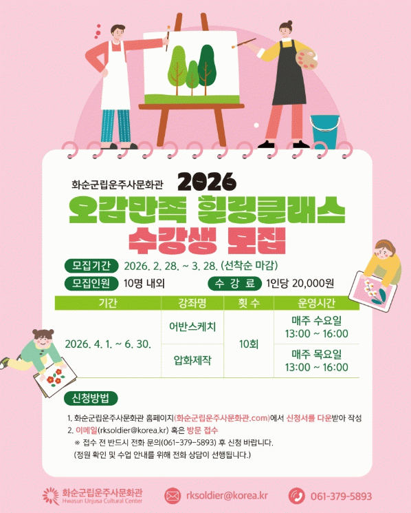 '오감만족 힐링클래스'는 2026년 4월 1일부터 6월 30일까지 3개월간 운영하고, 수강생 모집은 2026년 2월 28일부터 3월 28일까지 진행된다.