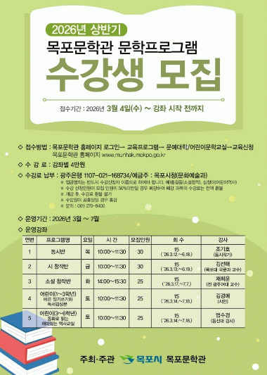 수강 신청은 3월 4일부터 강좌 시작 전까지 목포문학관 홈페이지를 통해 선착순으로 접수한다. 수강료는 강좌별 4만 원이며, 세부 일정과 운영 내용은 홈페이지에서 확인할 수 있다.