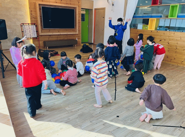 건강체조교실은 유아체육 전문 강사를 활용한 신체활동 프로그램으로, 다양한 움직임 놀이를 통해 기초체력을 기르고 또래 친구들과의 관계 형성을 돕는다. 놀이 중심 활동으로 진행돼 아이들이 자연스럽게 신체활동의 즐거움을 느끼며 적극적으로 참여하고 있다.
