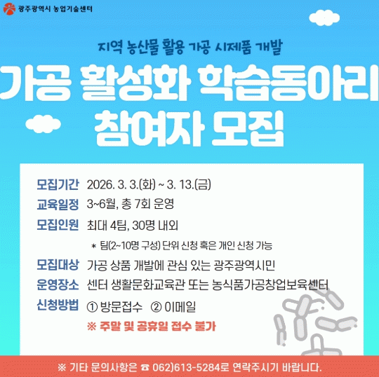자세한 사항은 광주농업기술센터 누리집이나 농업지원과 융복합지원팀으로 문의하면 된다.
