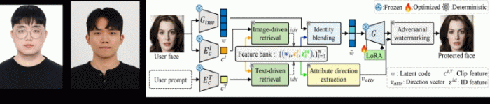 추가적으로 ‘속성 왜곡(attribute distortion)’ 기법을 제안하여 사용자가 눈, 코, 입 등 특정 얼굴 부위를 텍스트 프롬프트로 지정하면, 해당 부위와 관련된 정체성 방향을 인공지능 내부 표현 공간에서 찾아낸 뒤, 그 방향으로 미세한 워터마크 신호를 삽입함으로써 원본 이미지는 자연스럽게 유지하면서도, 딥페이크 생성 과정에서는 해당 부위가 어색하게 표현되도록 최적화했다.
