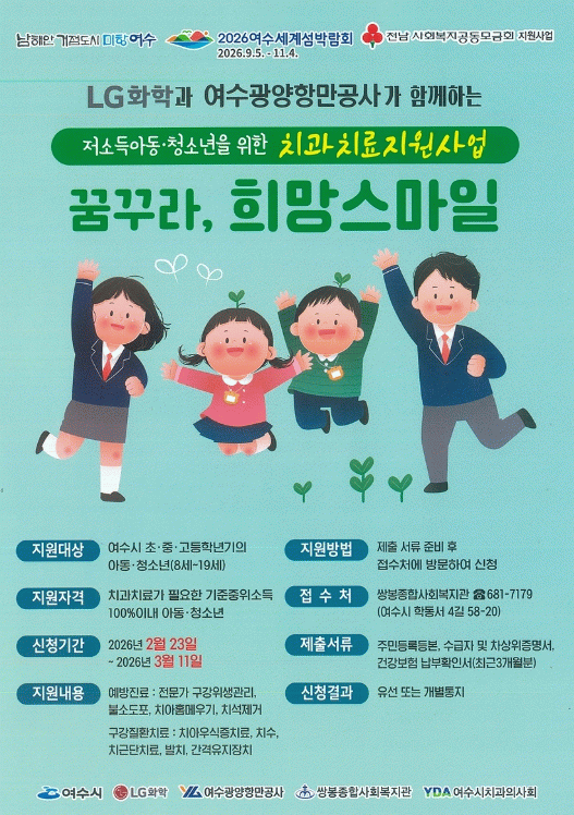 올해 사업은 LG화학 여수공장과 여수광양항만공사의 후원으로 진행되며 총 3,000만 원의 사업비로 1인당 50만 원 이내에서 예방 진료와 구강질환 치료비를 지원한다.