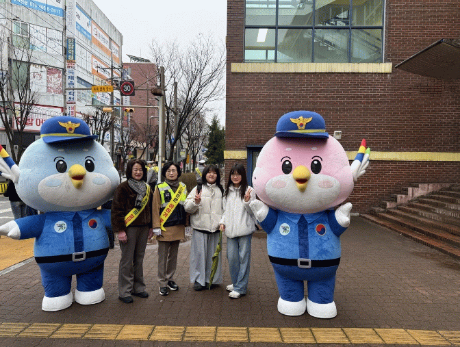 현장에서는 자치경찰 마스코트 ‘안전이’와 ‘행복이’가 “스쿨존의 노란 약속, 횡단보도 앞은 일단 멈춤!” 문구가 적힌 플래카드를 들고 등굣길 학생들을 맞이했다.