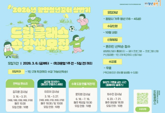 드림클래스 관련 자세한 내용은 광양청년꿈터 누리집을 확인하거나 광양청년꿈터로 문의하면 된다.