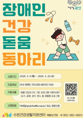 모집 대상은 광산구 거주 장애인 5인 이상의 자조 모임(4팀)으로, 선정된 팀은 건강 실태조사를 바탕으로 활동 분야에 제한 없이 동아리만의 맞춤형 건강 프로그램을 자유롭게 구성할 수 있다.