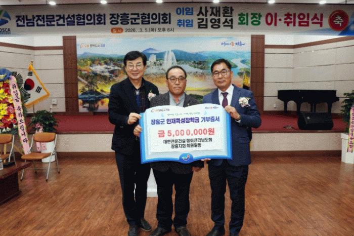 장흥군인재육성장학회 관계자는 “지역 발전을 위해 애써주시는 건설업계 관계자들의 따뜻한 관심이 학생들에게 큰 힘이 되고 있다”며 “보내주신 뜻이 지역 인재들의 성장으로 이어질 수 있도록 장학사업 추진에 더욱 힘쓰겠다”고 전했다.