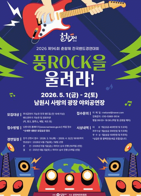 남원시 관계자는 “소리의 도시 남원의 명성에 걸맞은 수준 높은 경연을 통해 축제장을 찾은 관람객들에게 잊지 못할 음악적 즐거움을 선사할 것”이라며, “전국의 재능 있는 음악인들이 적극적으로 참여해 축제를 빛내주길 바란다”고 당부했다.