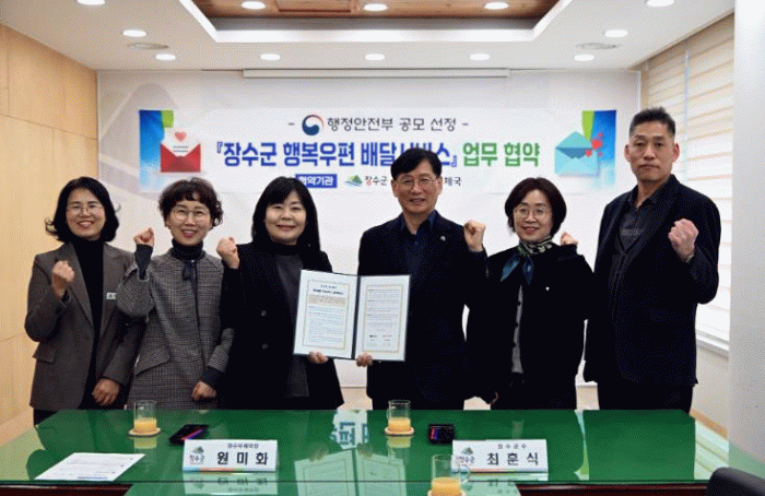 장수군은 이번 사업의 성공적인 추진을 위해 장수우체국과 협력체계를 구축하는 업무협약도 함께 체결하고, 복지 사각지대에 놓인 취약계층을 보다 촘촘하게 돌보기 위한 민‧관 협력 기반을 강화했다.