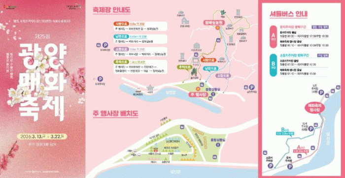 또한 광양매화마을 주요 거점 3곳을 방문해 스탬프를 모으는 ‘광양매화 스탬프투어’와 한국관광 100선 인증 QR코드 이벤트도 운영된다.