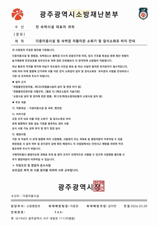 지난 9일 광산구 송정동에서는 한 숙박시설 관계자가 송정119안전센터를 방문해 ‘숙박시설 자동소화장치 설치 안내’ 공문 발송 여부를 문의했다.