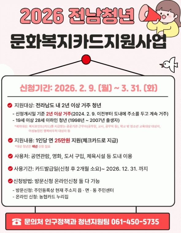한승헌 인구정책과장은 “문화복지카드 지원사업이 청년들의 문화활동과 자기계발에 도움이 되길 바란다”며 “앞으로도 청년 지원 정책을 지속적으로 추진해 나가겠다”고 말했다.