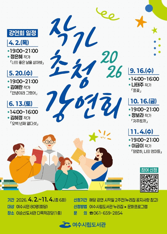 참여를 희망하는 시민은 여수시립도서관 누리집 문화프로그램 코너에서 신청하면 되며 회차별로 80명을 선착순 모집한다.