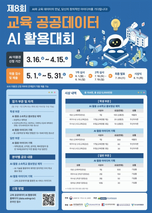 특히 올해는 초등학생도 참여할 수 있도록 ‘AI 활용 소속학교 홍보영상’ 분야가 신설됐는데 참가자는 이미지와 영상 생성형 AI도구를 활용해 소속 학교의 매력을 알리고 자랑하는 창의적인 영상 콘텐츠를 제작하면 된다.