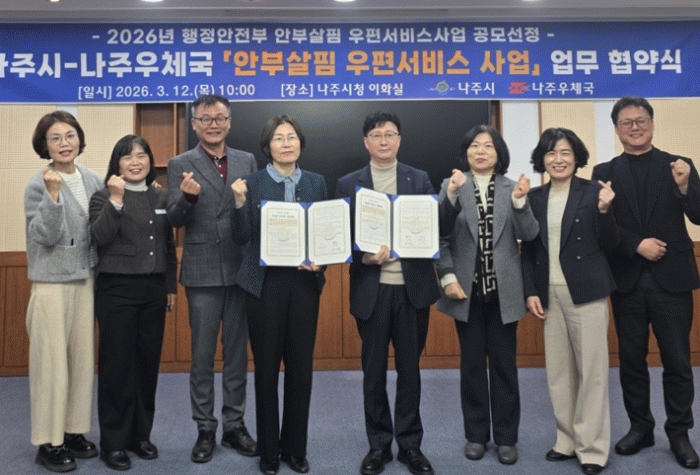 나주시는 행정안전부 ‘2026년 안부살핌 우편서비스 사업’ 공모에 선정돼 4월에 대상자를 선정하고 오는 5월부터 사업을 본격 시행할 계획이라고 13일 밝혔다.