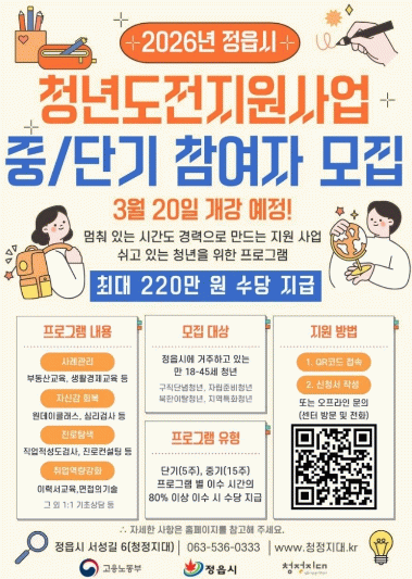 프로그램 참여 신청 및 기타 자세한 사항은 정읍시 청년지원센터 청정지대로 전화해 안내받을 수 있다.