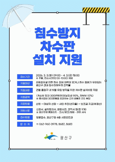광산구는 이번 사업을 통해 총 4억 8,000만 원을 지원할 예정으로, 신청자가 많은 경우 호우 피해 신고 이력이 국가재난정보관리시스템(NDMS)에 등록 및 확정된 경우를 우선 선발한다.