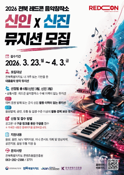진흥원 김성규 원장은 “전북의 유망 뮤지션들이 대중음악 산업에서 경쟁력을 갖춘 창작자로 성장할 수 있도록 적극 지원하겠다”며 “참신한 역량을 지닌 지역 뮤지션들의 많은 관심과 참여를 기대한다”고 말했다.