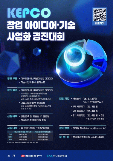 한전이 주최하고 한국표준협회가 주관하는 본 공모는 3월 26일(목)까지 진행된다. ▲기후테크·에너지 분야 창업 아이디어 부문 ▲유망기술 활용 BM(Business Model) 콘테스트 2개 부문으로 진행되며, 참가 자격은 에너지 분야 창업 아이디어 부문의 경우 예비 창업자 또는 창업 3년 이내 기업이다.