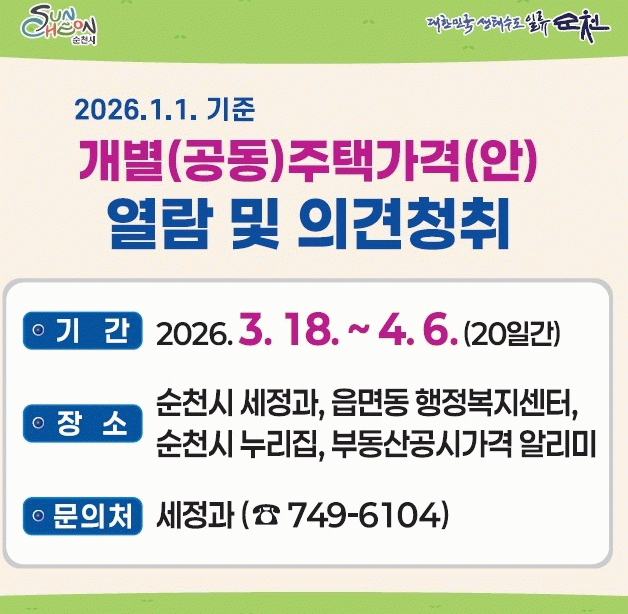 제출된 의견은 개별(공동)주택의 특성, 적정가격, 인근 주택과의 가격 균형 등을 종합적으로 검토한 뒤 순천시 부동산가격 공시위원회의 심의를 거쳐 개별 통지하고, 최종 확정된 개별(공동)주택 가격은 4월 30일에 공시할 예정이다.