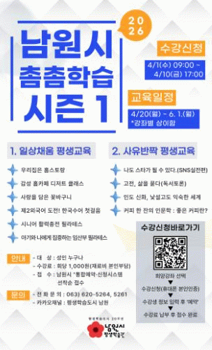 수강신청은 4월 1일 오전 9시부터 4월 10일 오후 5시까지 남원시 통합예약·신청시스템을 통해 선착순으로 진행된다.