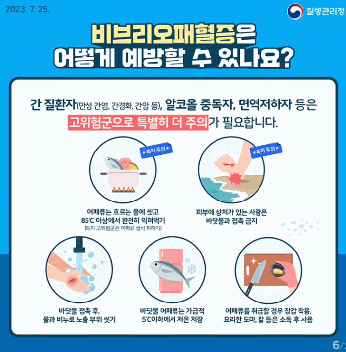 보건소 관계자는 비브리오 패혈증 예방을 위해 ▲어패류 충분히 익혀 섭취 ▲피부 상처가 있을 경우 오염된 바닷물 접촉 자제 ▲바닷물 접촉 후 깨끗한 물과 비누로 노출 부위 세척 ▲어패류 취급 시 장갑 착용 및 칼·도마 소독 후 사용 등 예방수칙 준수의 중요성을 강조했다.